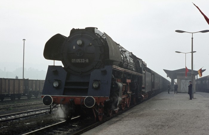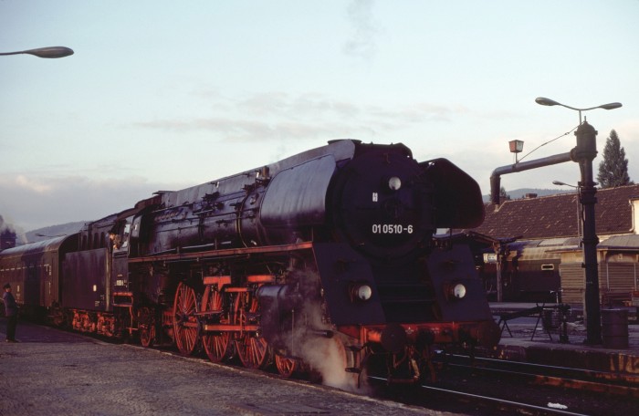 01 0519 nun am Bahnsteig vorm D 504 in Saalfeld, am 12.10.1976. (die spätere Kohlelok 01 519 der EFZ trägt hier noch ihre authentisch richtigen Anschriften und Betriebsnummer...;-)