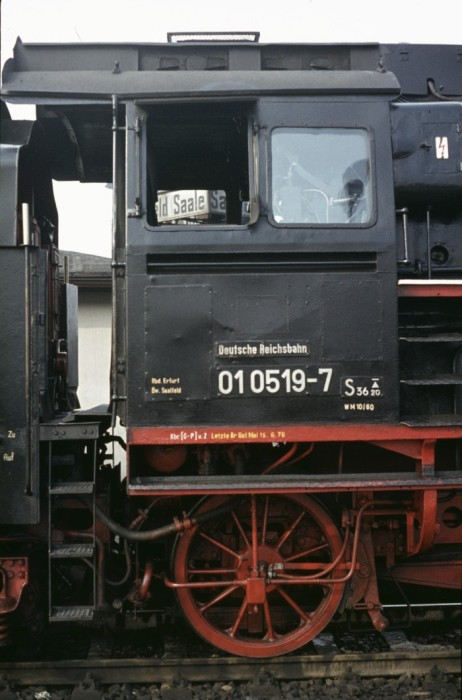 Das Führerhaus, unter dem ein Ölbrenner ist, und die "richtigen" Anschriften der 01 519, nämlich die mit der "Null"(!), fotografiert vor dem D 504 am Bahnsteig Saalfeld am 12.10.1976