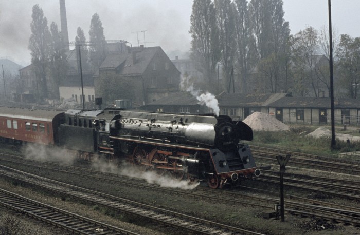 01 0534 mit P 3004 auf die Saalebahn, Ausfahrt Saalfeld, 12.10.1976.