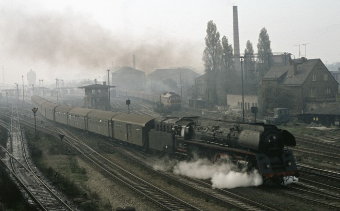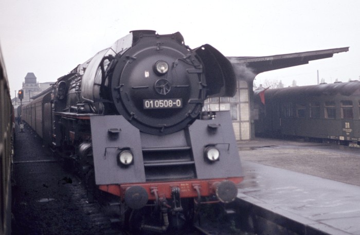 01 0508 vor P 3020 am Bahnsteig in Zeitz, 14.10.1976. Aus dem Gegenzug fotografiert, mit dem ich - nun schon wieder -
