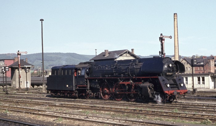 01 0522 muss nun einige “Sägefahrten” durchführen, um vom Bahnhof ins Bw zu gelangen, Saalfeld am 12.10.1976.