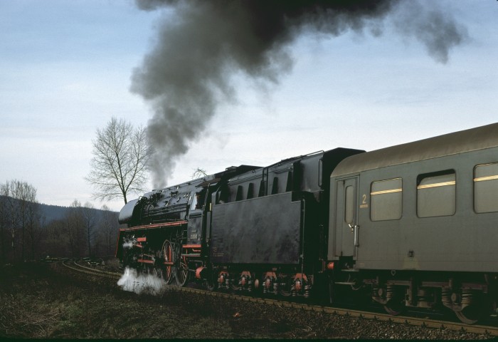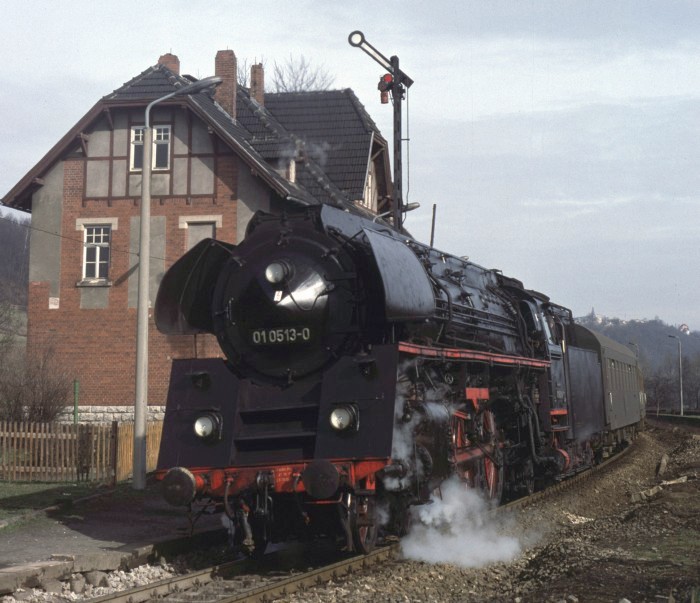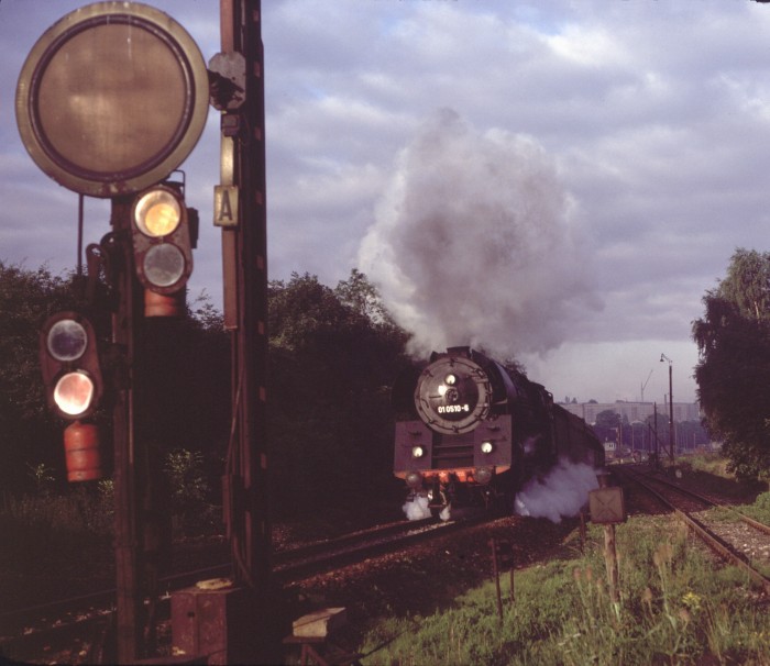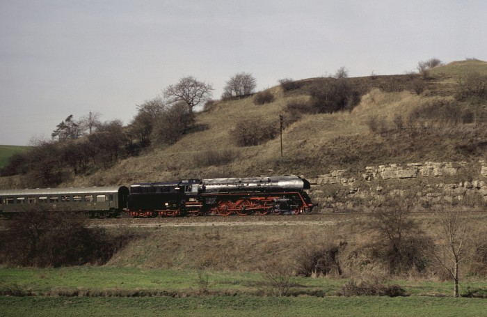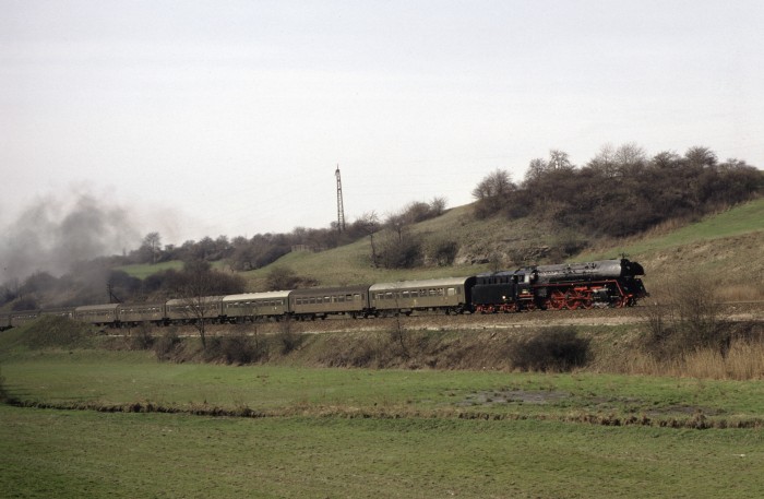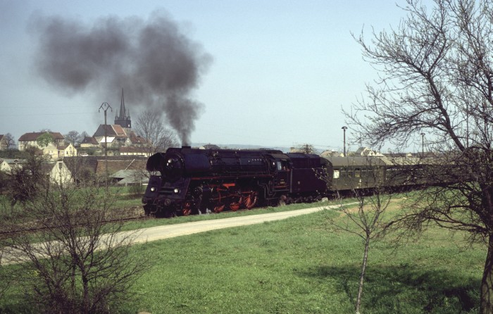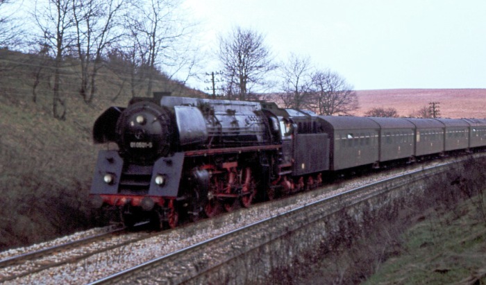 01 0501 mit P 4006 an der Ausfahrt von Saalfeld die Saalebahn ‘runter, 17:52h am 25.03.1978.