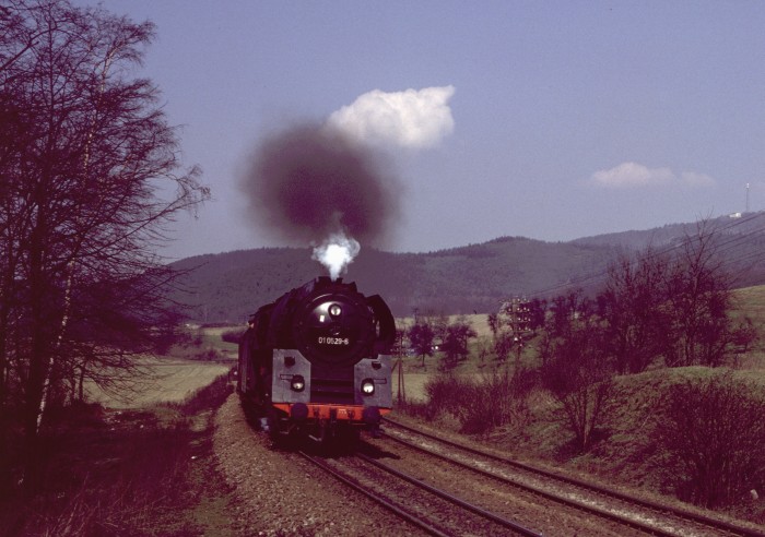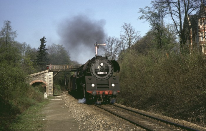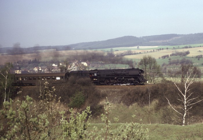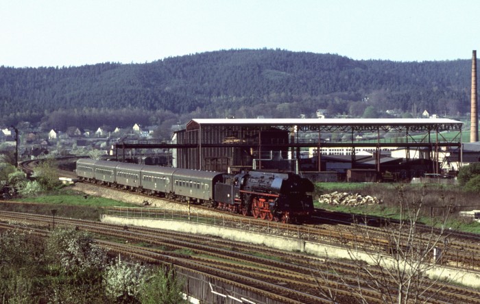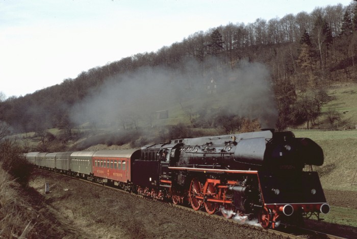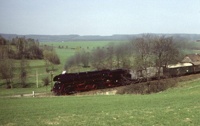 Noch einmal die 01 (0)501 mit Personenzug aus Gera, abwärts fahrend durch den bekannten Einschnitt oberhalb von Saalfeld, aber etwa 1,5 Jahre zuvor, nämlich im April 1978 fotografiert. (orig. Foto: Karl S.)