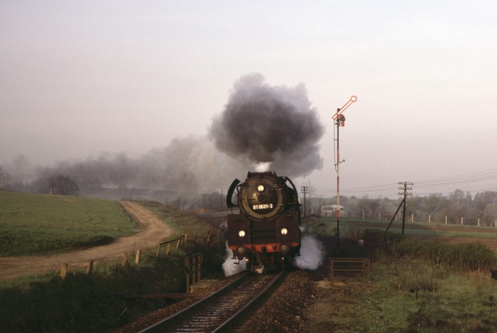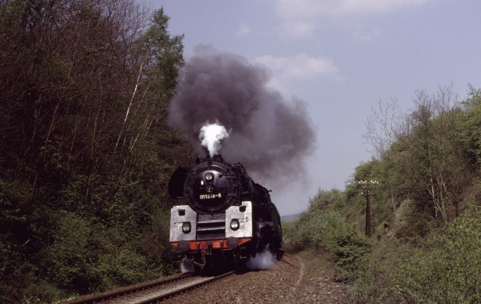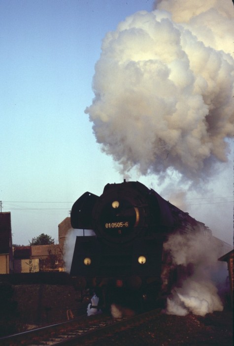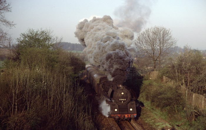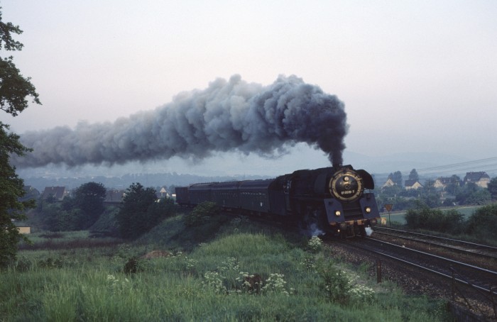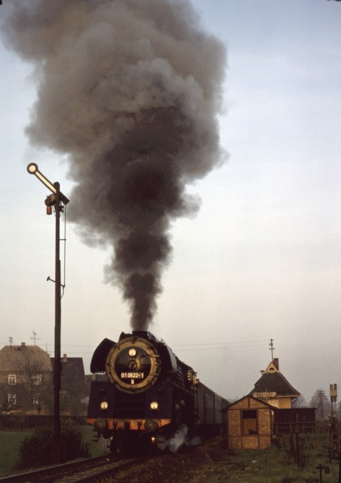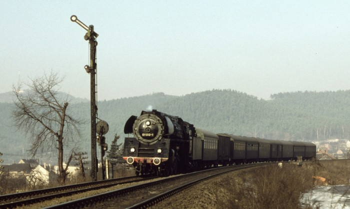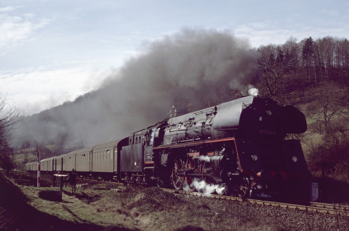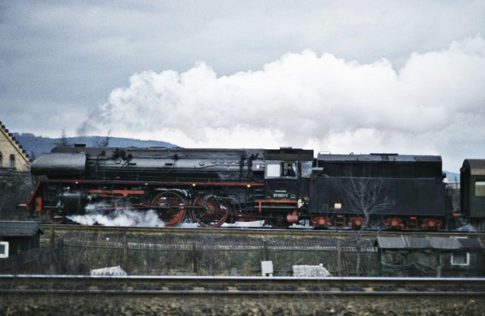 01 0522 wurde übrigens an diesem 21.März 1981 mit diesem schweren Zug bei der zu hörenden Fahrweise wortwörtlich etwas kaputtgefahren, es kam zu einem Schaden am Schieber etwa ab Kahla im Saaletal hörbar, ab Rudolstadt dann schon richtig "kaputt" klingend. Eine weniger dramatische Fahrweise hätte wohl jedoch den Fahrplan im Saaletal völlig verwirbelt, die Fahrzeit wären nicht annähernd zu halten gewesen. Aber egal, wir hatten es zusammen mit weiteren, zufällig getroffenen Soundfans im Zug sehr genossen - Das war die phantastischste 01.5-Mitfahrt, die ich jemals machen konnte!