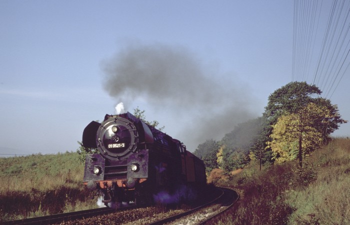01 0521 war an diesem Tag in den Personenzug-Umlauf “abgedrängt”: zu sehen vorm P 3023 hinter Ausfahrt Krölpa-Ranis Richtung Saalfeld, am 04.10.1980.