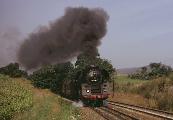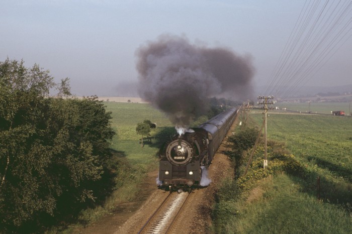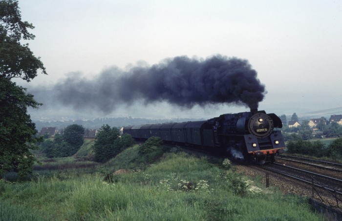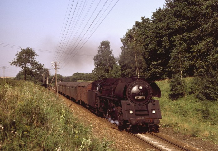 01 0501 (tatsächlich die “Erste” fuhr immer noch im Plandienst!) mit P 3025 hinter Weida, um 16:57h, am 27.08.1980.