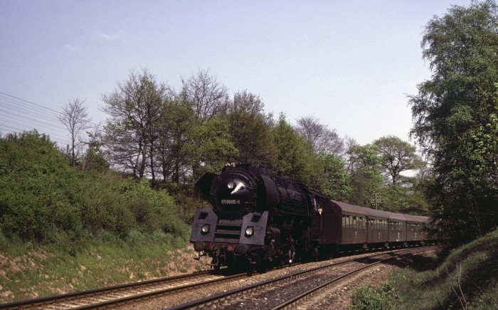 01 0505 mit dem P 3023 aus Leipzig abwärts rollend im Einschnitt vor Saalfeld, um 15:32h am 23.05.1980.