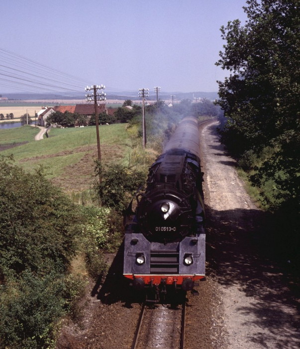 01 0513 mit P 3023 kurz vor der Einfahrt von Triptis (aus Richtung Gera), um 14:25h, am 27.08.1980.
