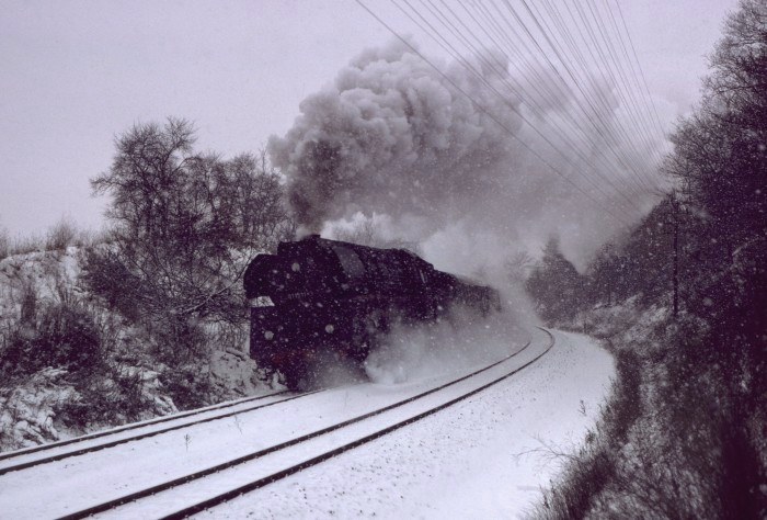01 1511 nun wieder mal vor dem E 802 im Schneegestöber donnert die Steigung nach Unterwellenborn hoch, um 10:05h, am 10.01.1980.