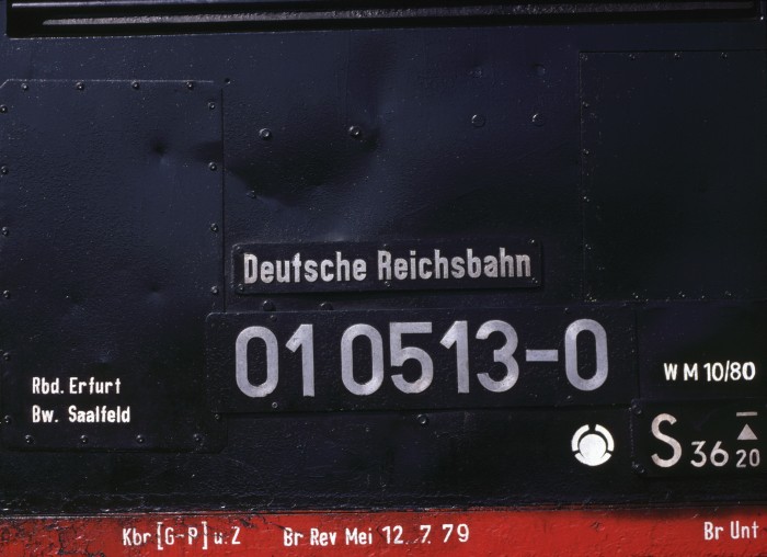 Hier zu sehen die Anschriften der - selbstverständlich ölgefeuerten - letzten Schnellzug-Dampflokomotive, die planmäßig von Hamburg aus am 2.Juni 1973 den allerletzten Schnellzug (nach Berlin) beförderte und sich dadurch bei mir als schlicht die 01.5 manifestierte, hier allerdings mehr als 6 Jahre später im Thüringischen, nämlich in Saalfeld, wie auf den Anschriften zu sehen ist.